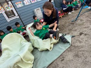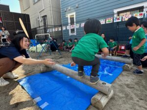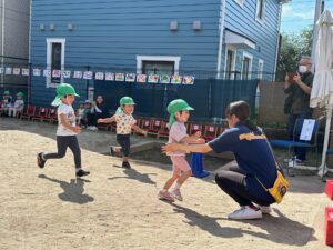 膝を曲げたり、バランスを取ったり、走ったり、日頃遊んでいる中で育った身体発達を保護者の皆様にも見てもらう事ができた日になりました。