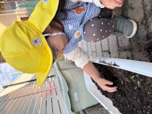 その後に、じゃあ土に植えてみよっかとお話しすると「やってみる!」と5人とも張り切っていました❣️球根をギュッと土の中に埋めてから優しく土を被せました‼️みんな本当に優しく土を被せていて驚きました‼️以前はなかなか微細な動きが難しかったのが…指先を使ってパラパラ上から土をかけたり、横の土を握ってポンポン優しく抑えたりと器用な手捌き❣️最後に水やりもしましたよ!